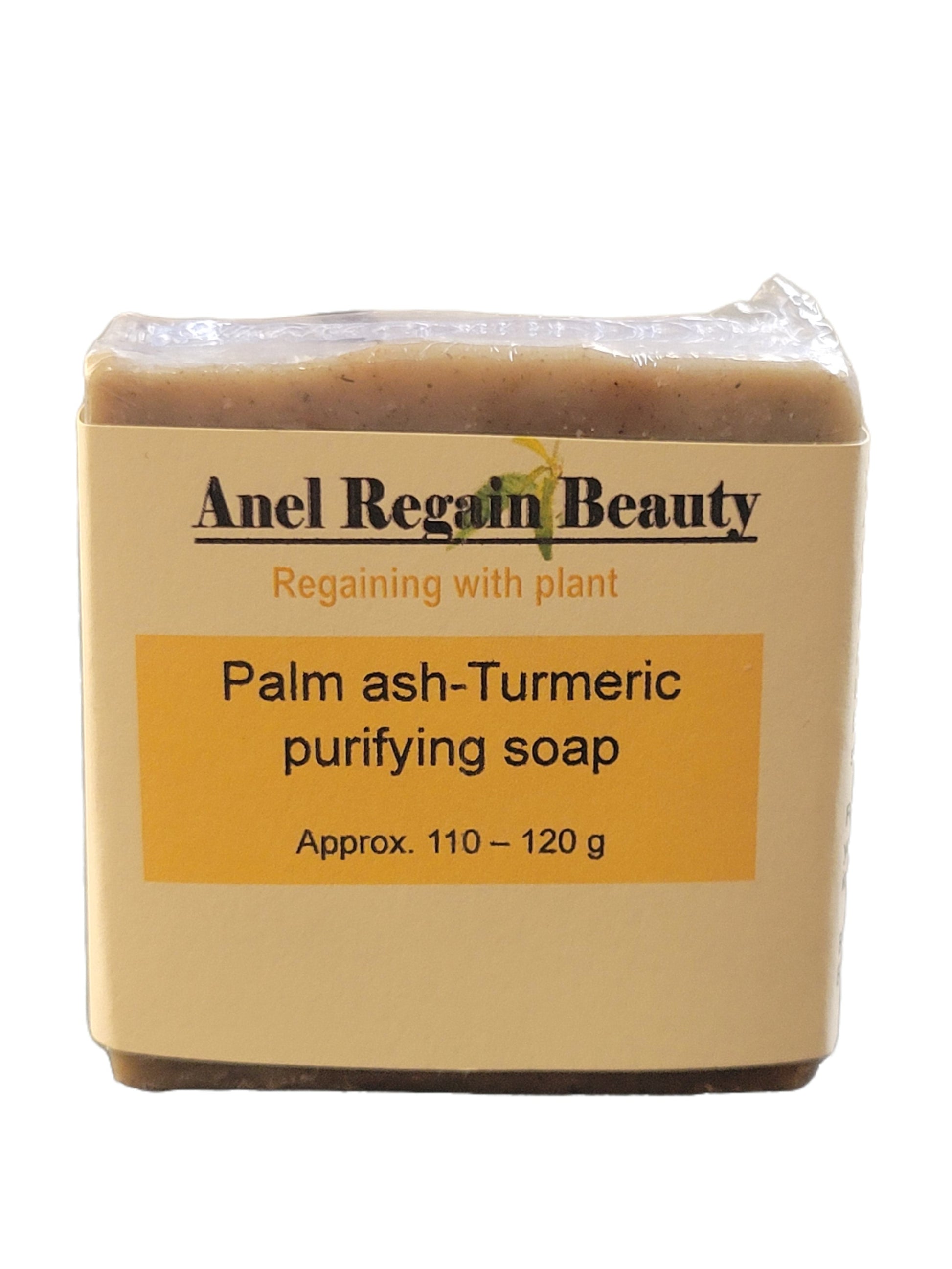 Our purifying palm ash and turmeric soap is handcrafted to deep cleanse, provide gentle exfoliation, hydrate, fight acne, and give a clearer skin. With anti-inflammatory, and antibacterial properties, this soap aims to combat acne causing bacteria and reduce inflammation. Turmeric helps fade acne spots, and enhance a brighter skin tone. In addition to carefully selected oils, this soap is rich in lather, cleanses, moisturise and hydrate skin.